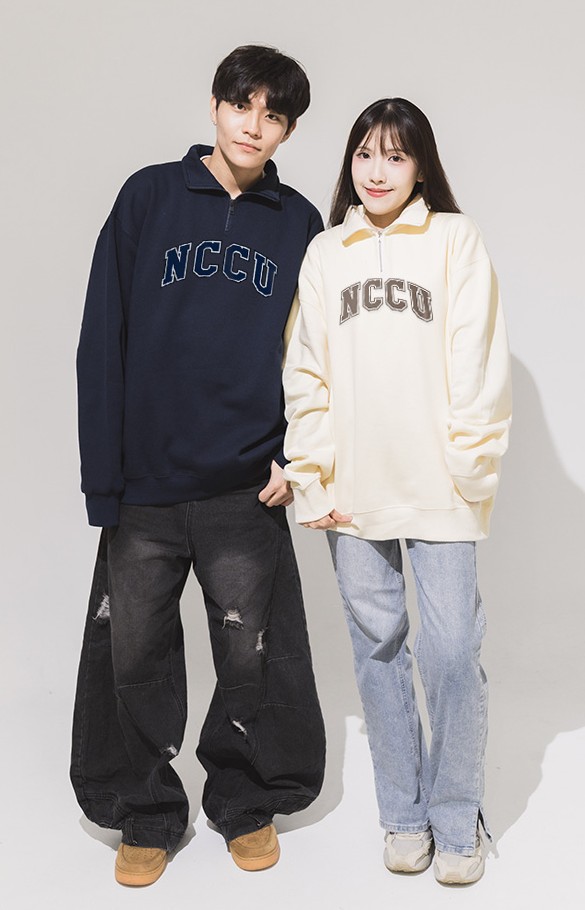 比起一般大學T,更具設計感的半開拉鍊搭配立領剪裁,保暖同時也能自由調整穿搭氛圍。